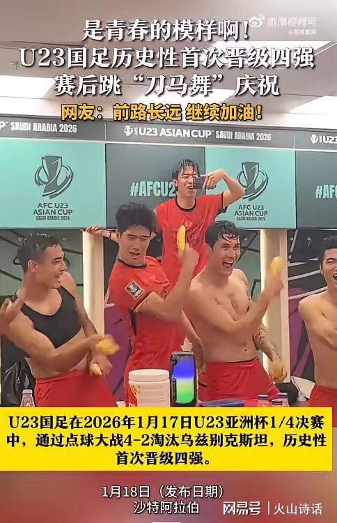 另据媒体报道,U23国足在2026年1月17日U23亚洲杯1/4决赛中,通过点球大战4-2淘汰乌兹别克斯坦,历史性首次晋级四强。